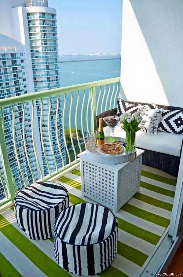 Một tấm thảm thật mỏng, thật nhẹ với những gam màu xanh tươi đan xen với trắng sẽ mang lại vẻ đẹp mát mắt cho ban công