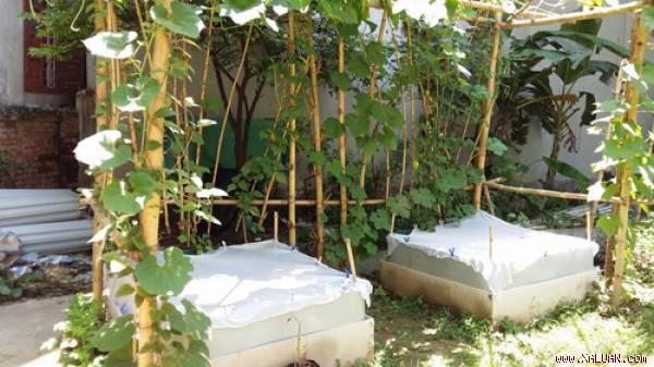 Từ nỗi bức xúc mùa hè không có rau cải do sâu bướm đẻ trứng và xà lách héo rũ vì nắng, chị đã nghĩ ra cách tận dụng màn cũ che cho rau. Chị chỉ mắc màn cho các luống cải, xà lách và dưa non mới gieo.