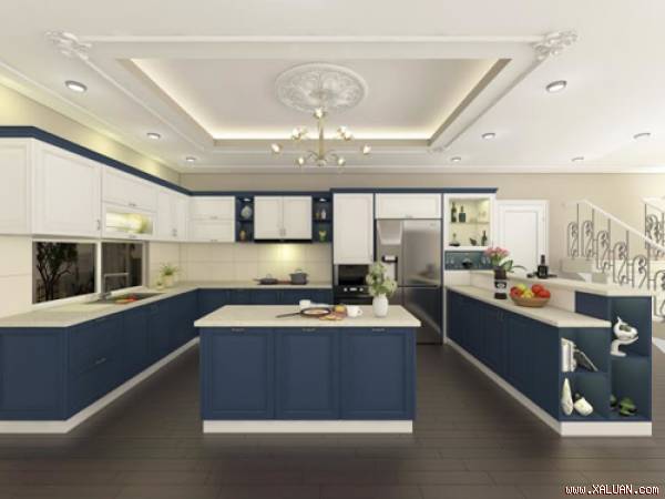 Mặt bằng căn bếp này khá rộng, lại nằm trong khu biệt thự cao cấp, đa phần nội thất ở đây đều được thiết kế mang hơi hướng hoài cổ. Tuy nhiên, với gia đình vợ chồng trẻ, nên tôi chọn chất liệu PVC bề mặt có vân gỗ và gờ phào, màu xanh coban làm tông chủ đạo phối cùng trắng rất bắt mắt và ấn tượng. Không gian vẫn có chút gì đó hoài niệm mà không mất đi vẻ điệu đà, trẻ trung của cuộc sống hiện đại.