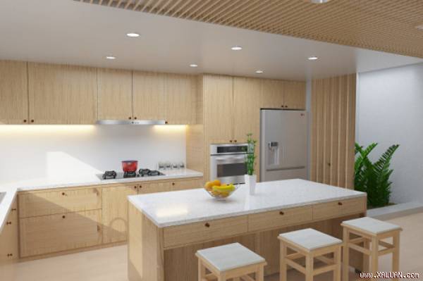 Việc sử dụng kết hợp đảo bếp đã tạo nên nhiều công năng. Ngoài chứa đồ khô, đảo bếp còn giúp người nấu ăn dễ dàng thao tác mọi hướng và cũng tạo nên điểm nhấn cho căn bếp.